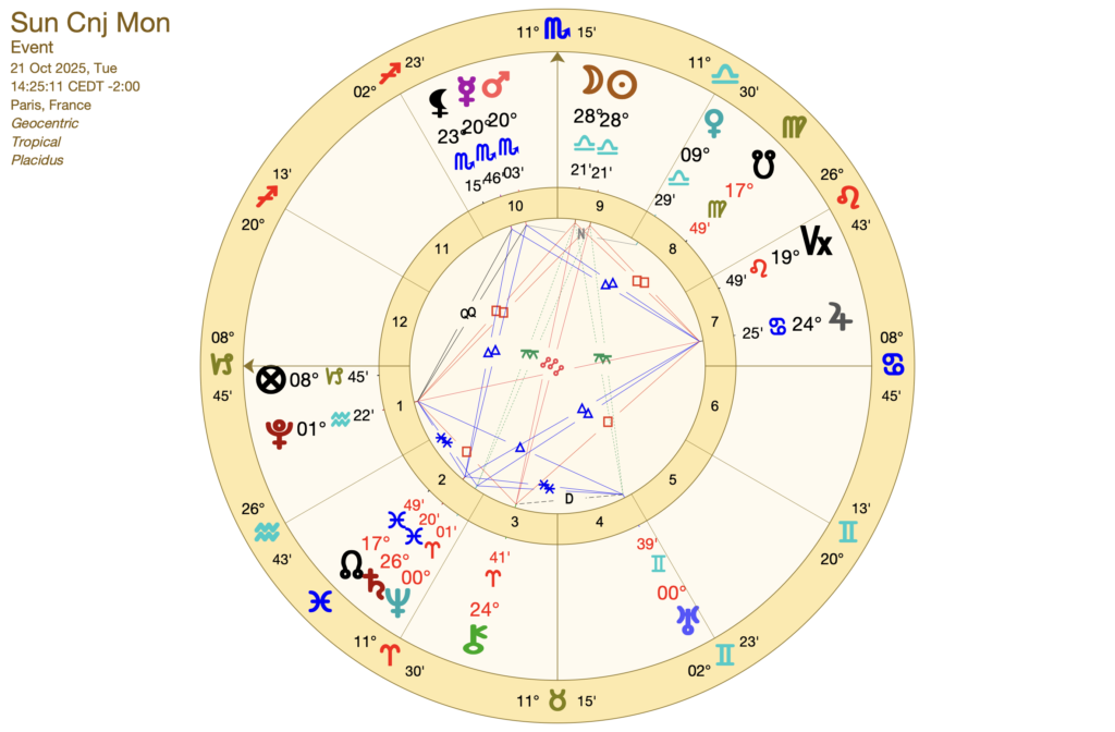 Dès le 23 octobre, le Soleil entre dans le signe du Scorpion et la dualité Balance Scorpion pourrait resurgir et se manifester durant toute cette lunaison, car la NL se sera formée dans le signe de la Balance. Il y a un véritable changement de vibration et d’énergie. Nous passerons d’une énergie de conciliation à une énergie de confrontation et de régénération. La Balance nous aura appris à vivre ensemble, à respecter l’autre, à trouver des compromis. L’énergie Scorpion nous poussera à dépasser ces compromis, à oser la vérité, à transformer ce qui ne fonctionne plus dans nos relations.