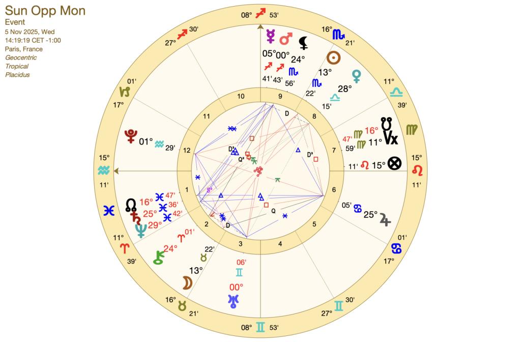 La réponse à ce questionnement nous permettra d’ajuster plus consciemment la manière d’être en relation avec les autres. Les attachements « affectivo-matériels » qui bloquent ou ralentissent notre évolution seront également mis en lumière. Ce retour sur soi permettra de libérer une nouvelle dynamique à mettre en œuvre dans nos interactions relationnelles. Ce questionnement introspectif pourrait nous préoccuper durant toute la rétrogradation de Mercure entre le 9 et le 29 novembre, afin de développer des relations dans un véritable échange, à la fois plus profond et plus authentique durant la lunaison suivante.
